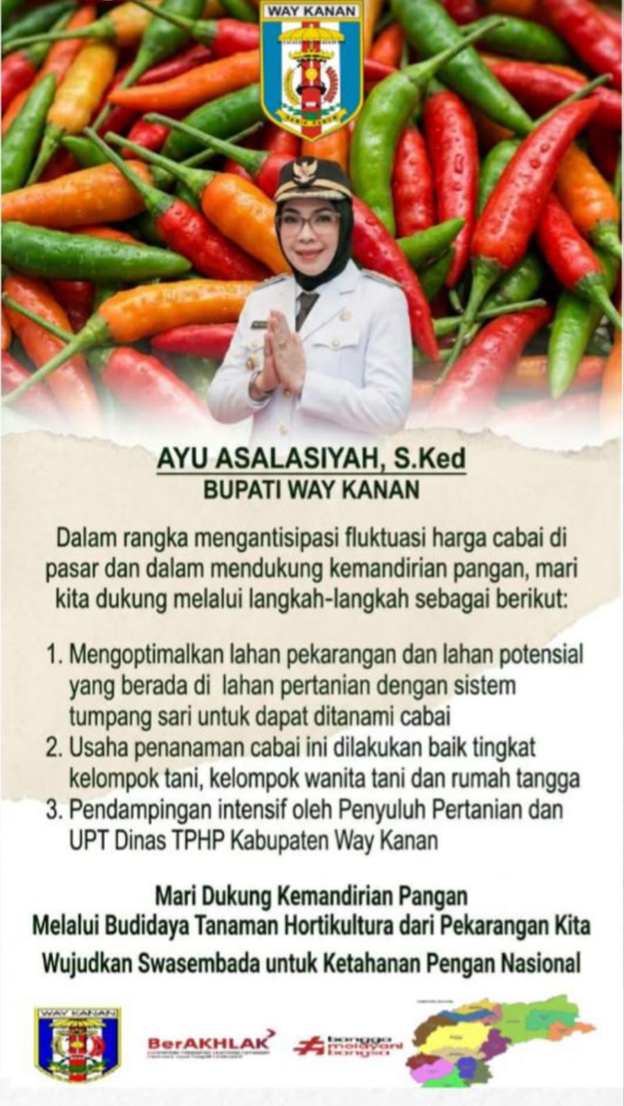 “Dengan menanam cabai di lingkungan sendiri, kita tidak hanya membantu keuangan keluarga dari fluktuasi harga, tetapi juga berkontribusi langsung pada swasembada cabai berkelanjutan di Way Kanan,” tulis Bupati dalam edaran tersebut.